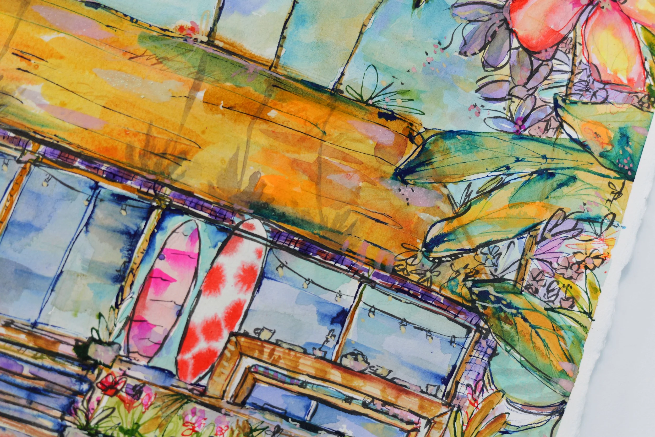 Hi, Iβm Rebekah, the artist and creator of Goldfish Kiss. I make colorful, feel-good art inspired by the ocean, flowers, and the sunny moments life serves up. Watercolor is my jam, mainly because itβs loose, unpredictable, is a blast to layer, and makes each piece a vibrant journey thatβs impossible to replicate. I paint everything from a messy desk in the corner of a room, and itβs pretty darn amazing to see the pieces that have come out of this little space.